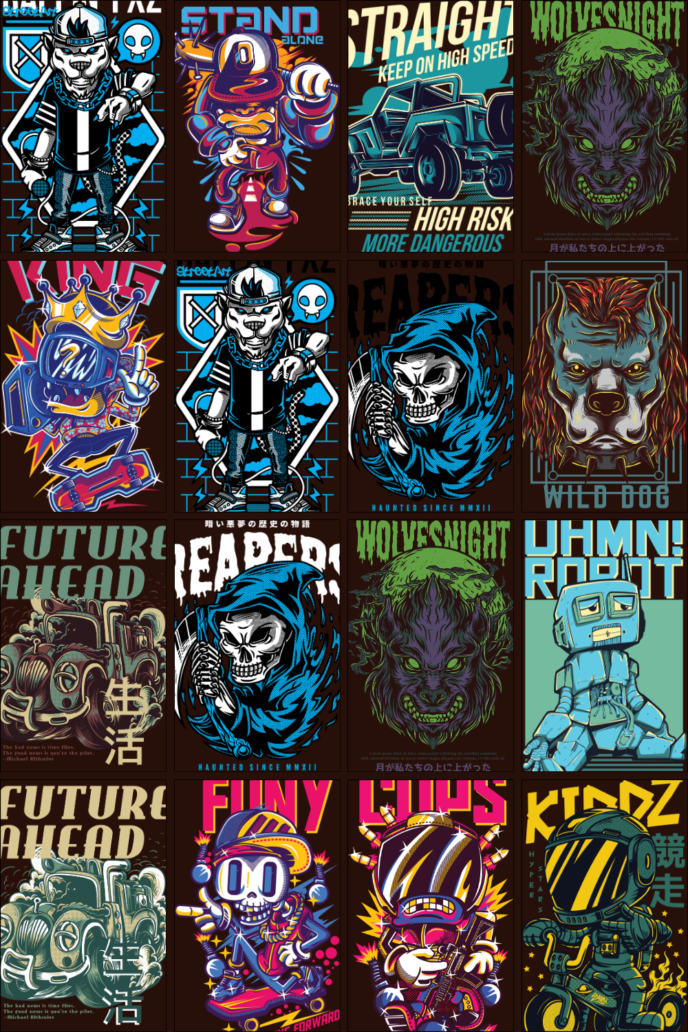 Streetwear buyers, gamers, and pop-culture audiences prefer illustrated designs that look like real brand graphics. This bundle is created around that demand. Each design works as a centerpiece artwork suitable for apparel, stickers, and decorative products.