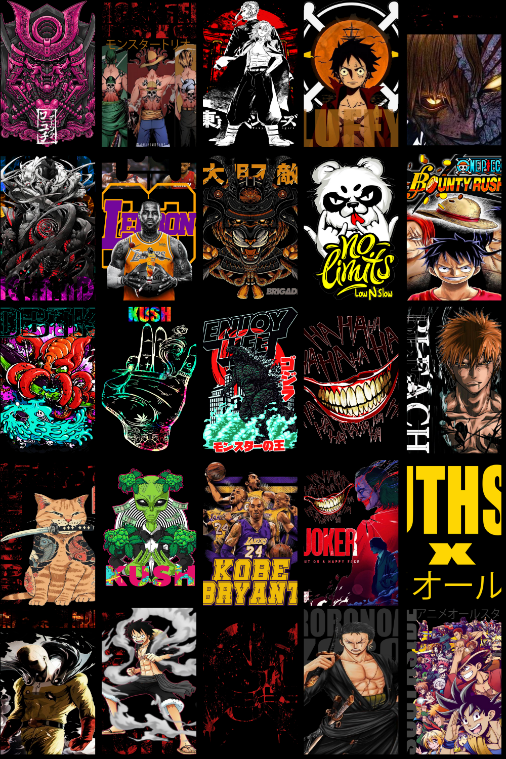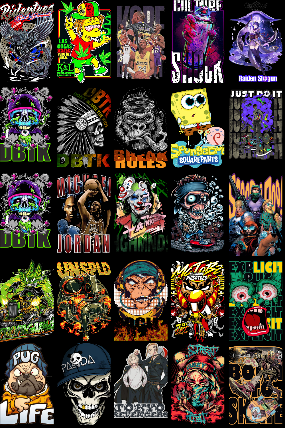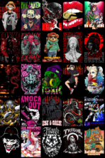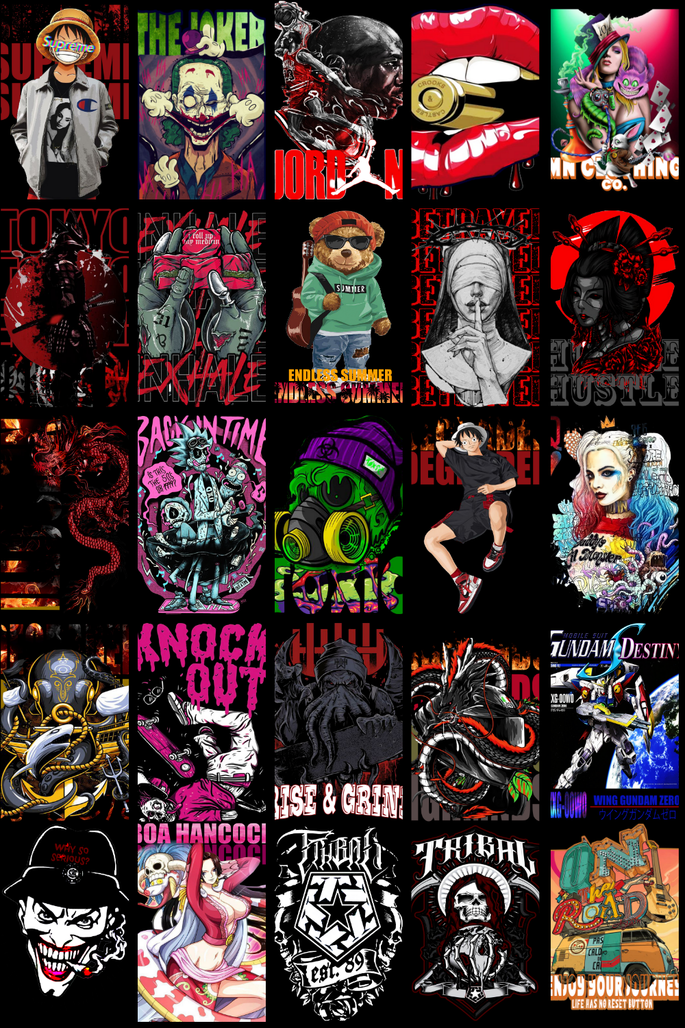 The designs showcased in the preview images reflect the exact aesthetic included in this pack — dark anime energy, intense expressions, urban streetwear influence, gothic tones, cyberpunk highlights, and bold contrast that stands out on apparel. These graphics are specifically structured to work exceptionally well on T-shirts, hoodies, oversized streetwear fits, posters, wall art, and stickers.
