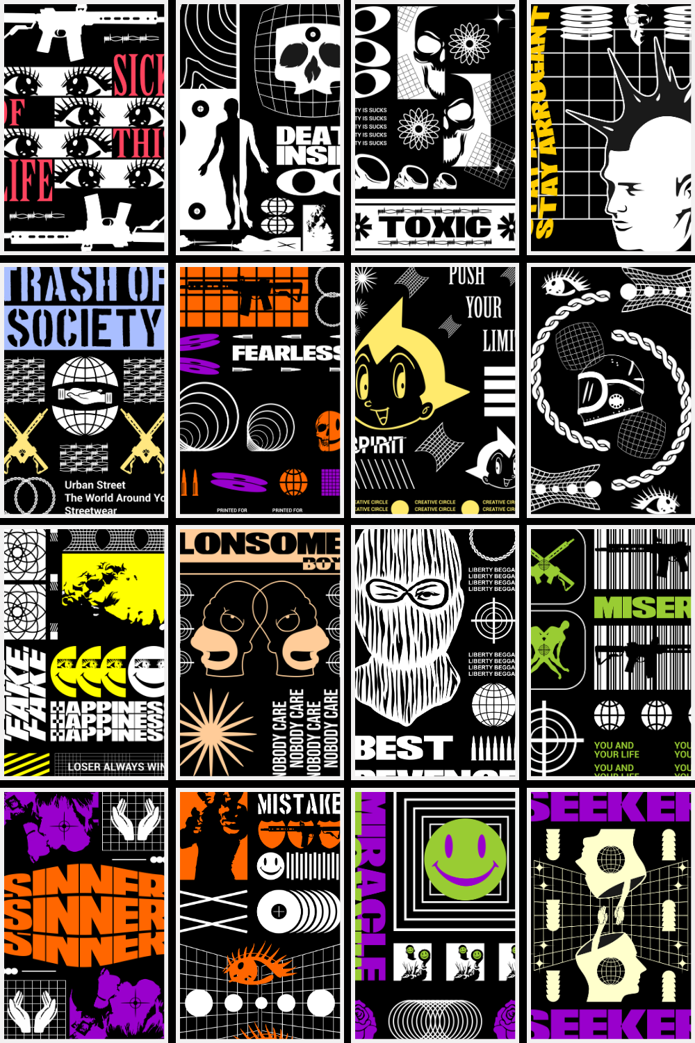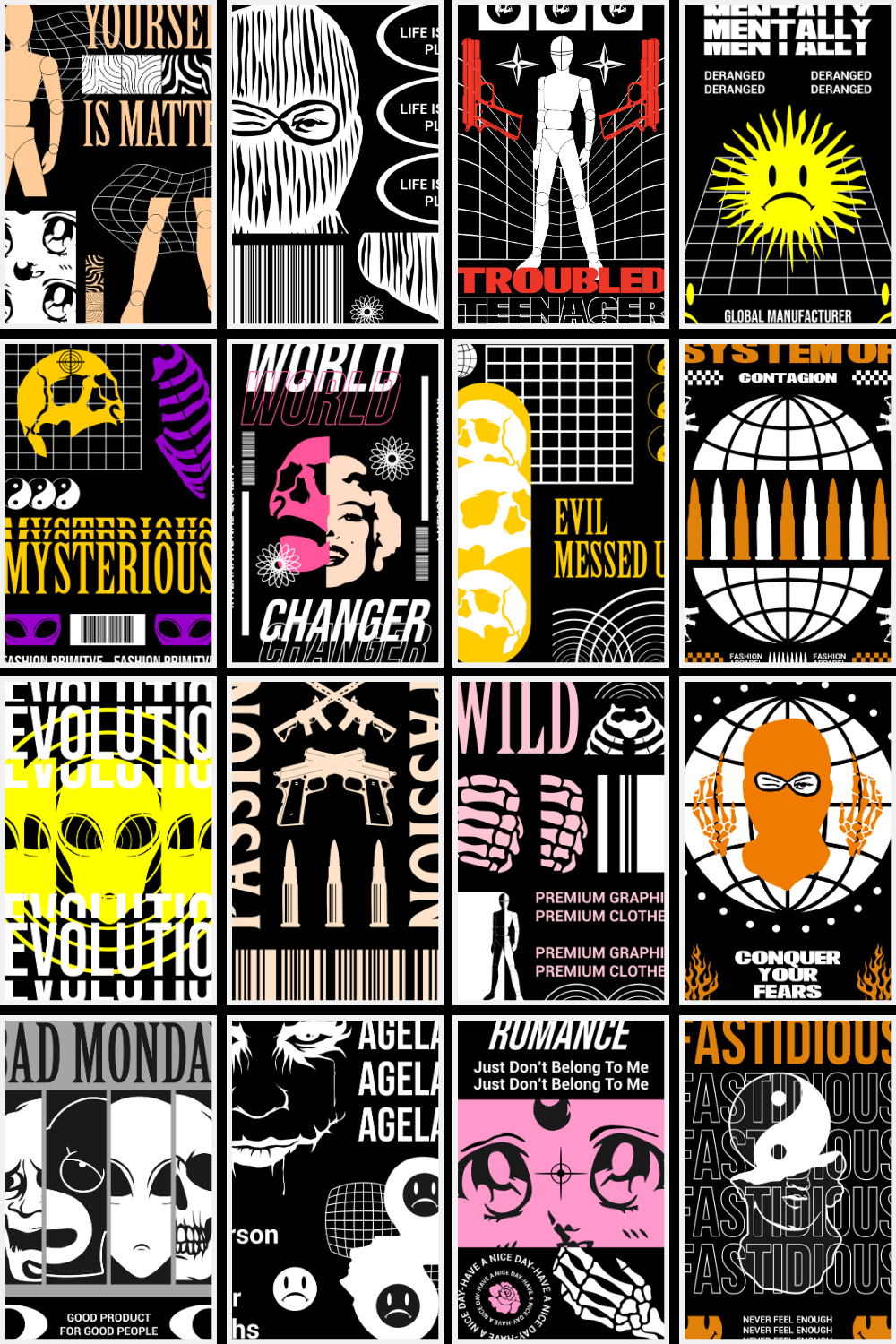 This urban streetwear design bundle features 100+ categorized graphics inspired by modern fashion trends, underground culture, and aesthetic digital art.